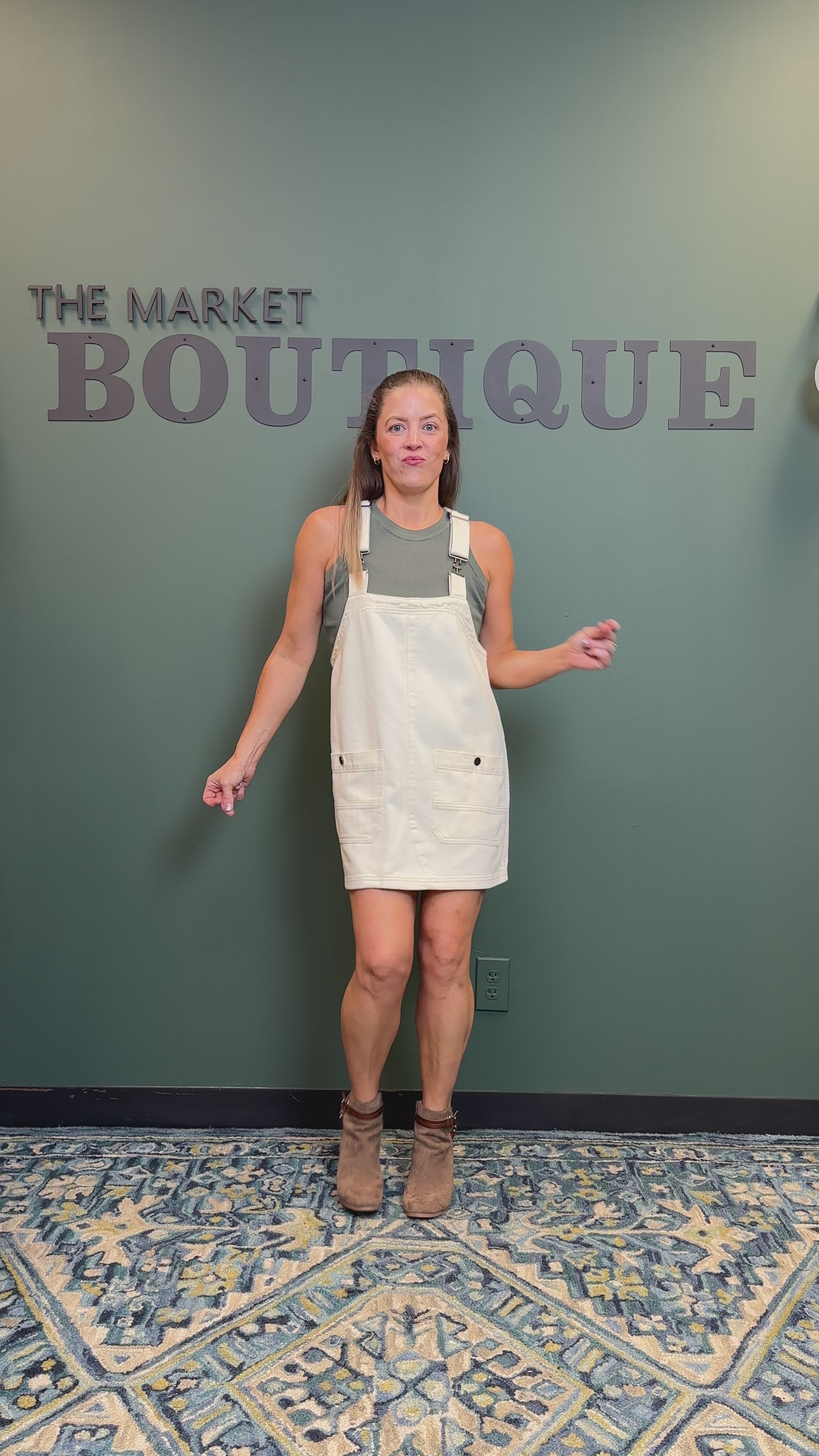 Mineral washed overall mini dress featuring a square neckline, detachable and adjustable straps, two open front pockets with button closures, added seams throughout for detail and is a boxy silhouette.