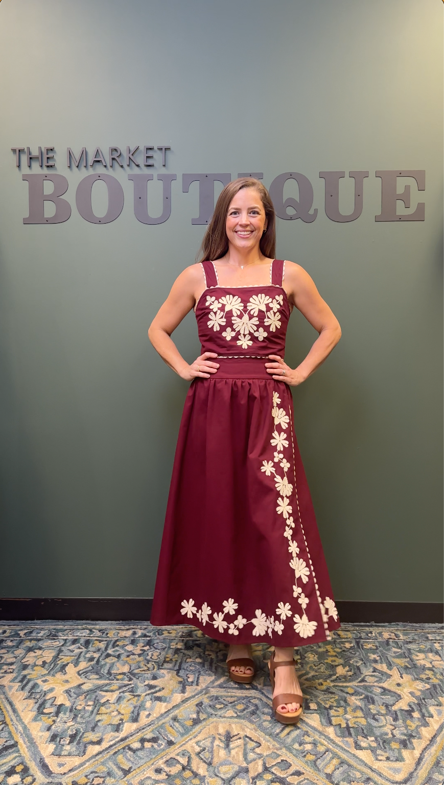 This deep maroon midi skirt is giving major fiesta vibes with its playful white floral embroidery dancing down the front and around the hem. The flattering wrap style and button detail make it both comfy and chic. Perfect for twirling your way through sunny days and sangria nights!